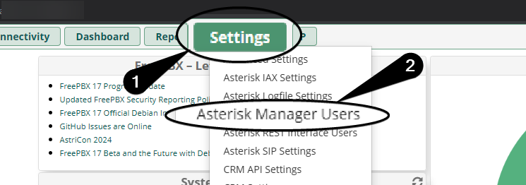 Login to the FreePBX portal and configure a user for Zabbix to use against the Asterisk API.