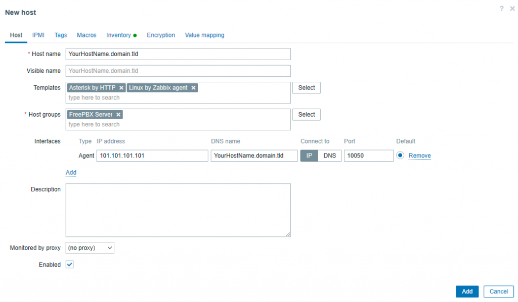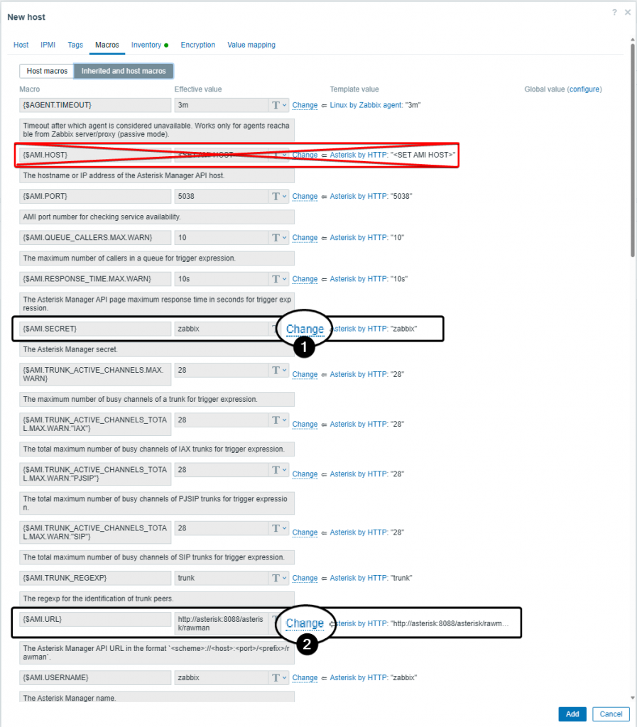 to include Asterisk by HTTP and Linux by Zabbix agent.Configure
